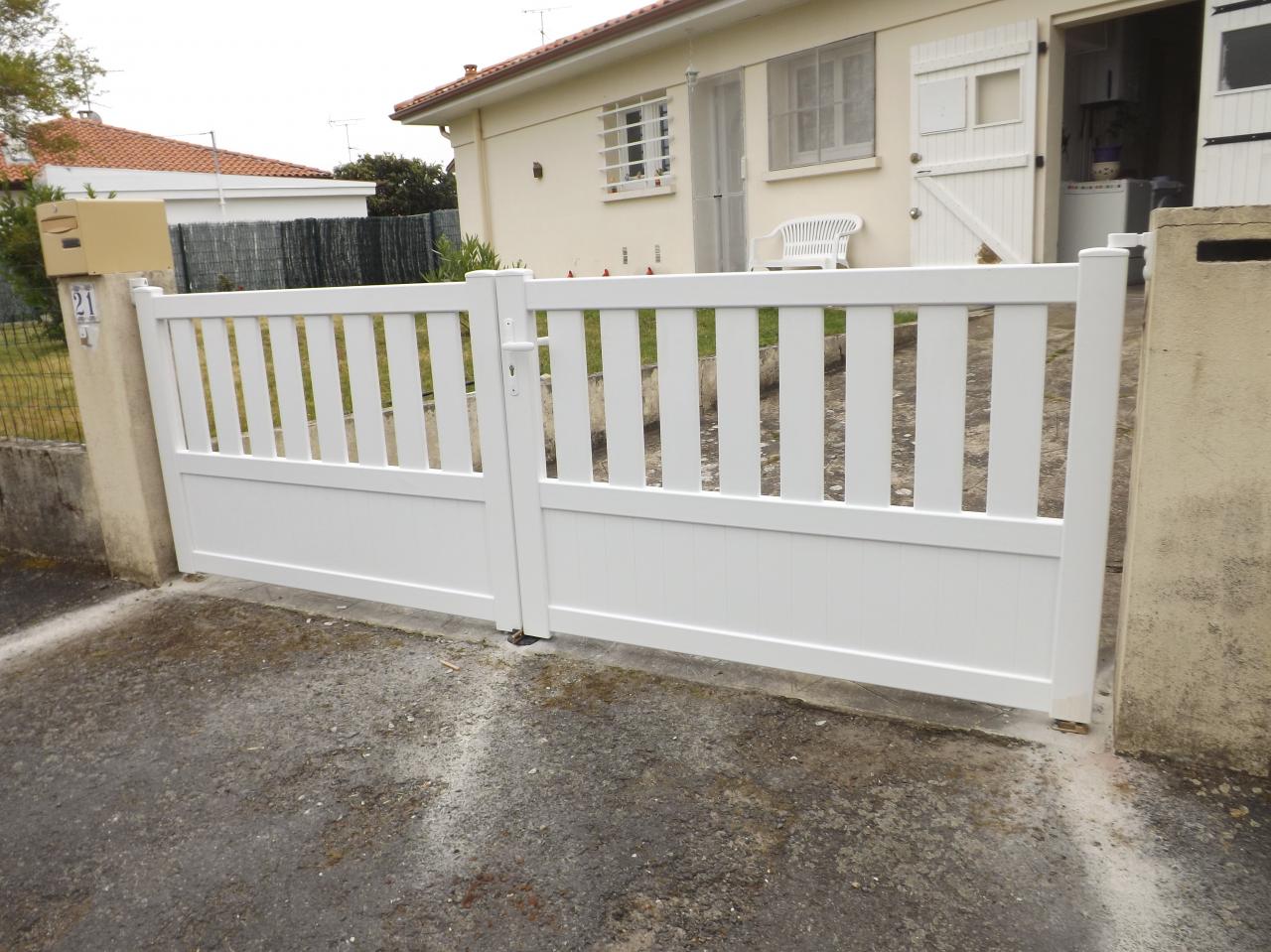 Portail PVC avec soubassement plein et barreautage haut posé sur Saint Paul les Dax